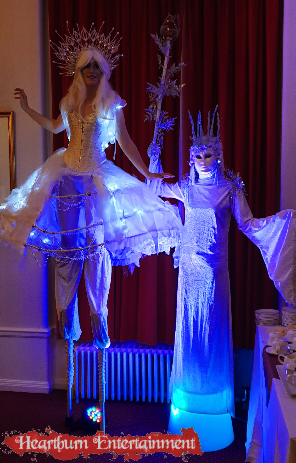 The ice blue LED's add a magical foozen touch to our Ice Queen human statues.